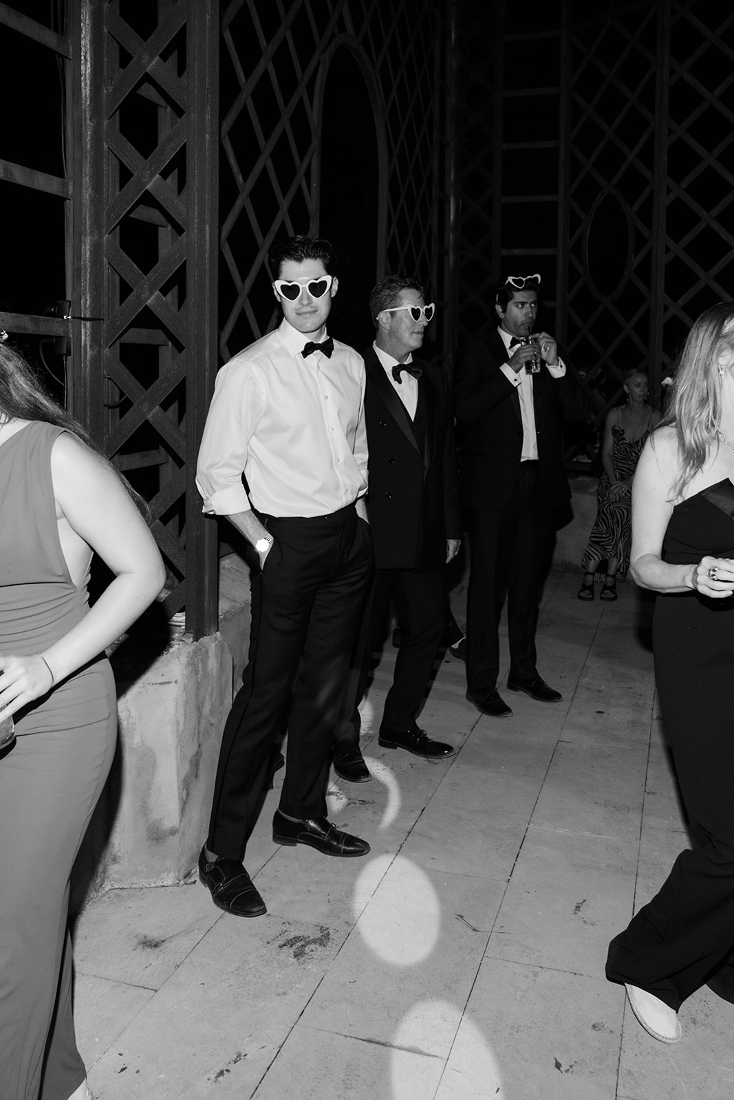 The wedding weekend began with a relaxed get-together by the pool, overlooking the coastline. The late-afternoon sun bathed the castle grounds in a golden glow, while violin and saxophone music drifted through the warm September air. Friends and family across the world arrived, embraced, and settled into the atmosphere.